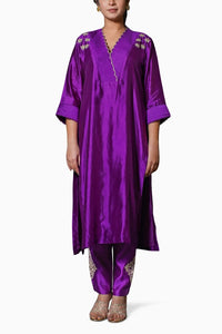 This vibrant two-piece set is a celebration of craftsmanship and color, featuring a knee-length kurta with a side slit adorned with hand-embroidered zardozi bootis. The elegant V-neck is beautifully framed with scallop detailing, while the 3/4 sleeves are finished with button loops, adding a refined touch. Paired with it are straight-fit silk pants, which showcase matching hand-embroidered zardozi work, creating a cohesive look.