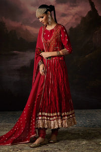 Featuring the Noor Red Lehenga Set by Swatti Kapoor's Firdaus collection. This regal four-piece ensemble showcases hand embroidery across a Banarasi Chanderi brocade blouse, gilet, Chanderi lehenga, and dupatta in deep red, exuding timeless elegance and artisanal craftsmanship.
