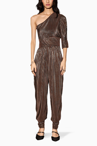 Featuring the Nora Jumpsuit by Kay Kay: a stunning ensemble designed to turn heads. Crafted from pleated fabric in rich brown with shimmering gold foil accents, this regular-fit set exudes luxury and style. Elevate your wardrobe with this glamorous jumpsuit from Kay Kay.