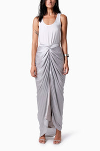 The Nora Draped Skirt is our signature draped skirt with a slit along the center. High waisted with a pencil cut, it is draped to flatter the curves of your body. Wear it with a white tee for a fun day look and a sexy blouse for the night. Closes on the side with a concealed zip.