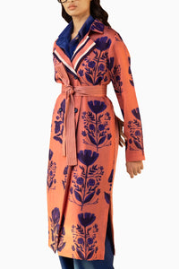 The Nordic Coral Trench is the statement piece of this collection. Featuring a bold blue Nordic print on a vibrant coral background, this trench is a must-have for making a style statement. The collars feature contrasting stripes and the trench comes with a belt to cinch the waist, creating a flattering silhouette. Elevate your wardrobe with this trendy and eye-catching piece.