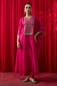 Featuring a pink silk Chanderi kaftan, richly adorned with gota and hand embroidery, and embellished all over with delicate pearl tassels. Paired with comfortable cotton silk pants and accompanied by a short cotton slip, this ensemble effortlessly blends elegance with comfort.