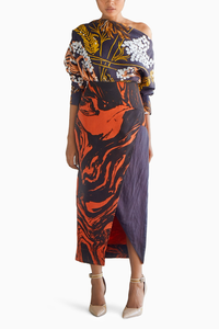 Featuring mid sleeve length off shoulder top with our Window Leaf print in multi-color on black base and a plain black back. The cuffs have shell button fastening. Paired with black marble print on a tangerine base. The fit of a pencil skirt with great legroom courtesy the drape detail. The upturned drape is held by top stitch detail.