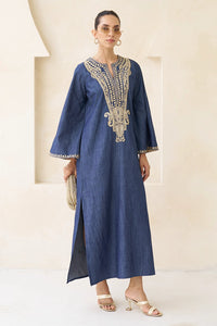 The Nova kaftan with pants come in a stretchy denim with stunning emb at the neck and sleeves, offering a fun fit for Diwali Dos.