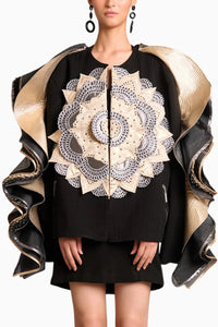 Featuring a black quilted microfiber jacket with a 3D mandala patch and metallic ruffles, this piece blends bold texture with statement detailing.