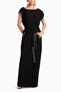 Featuring a black microfiber belted kaftan with crystal rope detail, this effortlessly elegant piece blends relaxed draping with refined sparkle. The fluid silhouette is cinched at the waist with a shimmering crystal rope belt, adding structure and a touch of glamour. Perfect for evening gatherings, resort wear, or sophisticated lounge looks.