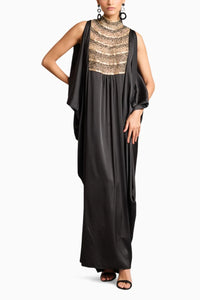 Featuring a black satin kaftan with a mixed media gradient yoke, this piece offers a sleek silhouette elevated by artistic, textural detailing. Ideal for elegant evenings or special occasions.