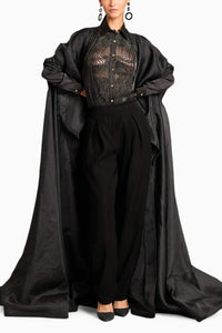 Featuring a black organza opera jacket, this lightweight piece adds dramatic elegance and sheer sophistication to any ensemble.