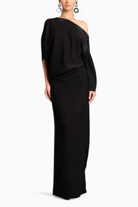 Featuring a black microfiber crystallized asymmetric slitted gown with crystal rope toggle detail, this striking piece exudes modern elegance. The asymmetric design and thigh-high slit create a bold, sculptural silhouette, while shimmering crystal accents and the unique rope toggle closure add a touch of luxe sophistication.