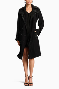 Featuring a black microfiber crystallized trench, this statement outerwear piece combines sleek structure with eye-catching sparkle. The microfiber offers a smooth, comfortable fit, while crystal embellishments add a touch of refined glamour. Perfect for elevating both day and night looks with a bold, fashion-forward edge.