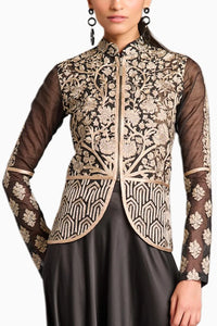 Featuring a black organza jacket with intricate zari embroidery, this piece adds elegant texture and shimmer to any outfit.