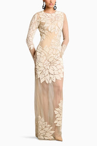 Featuring a skin sheer column gown with ivory sequin 3D floral embroidery, this delicate design blends subtle elegance with intricate texture for a graceful statement.