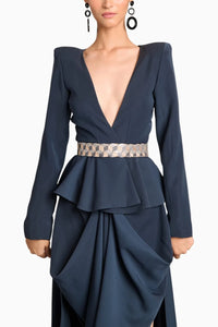 Featuring a slate microfiber peplum blazer with power shoulders, this sharp silhouette blends structured elegance with a modern edge.