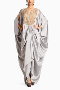 Featuring a steel grey kaftan with a zari embroidered forest yoke, this elegant piece showcases intricate craftsmanship and a graceful silhouette—perfect for sophisticated occasions.