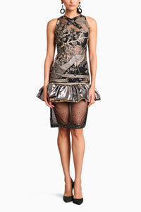 Featuring a black sheer dress with zari forest embroidery, metallic bauble accents, and a gradient sequin net hem, this dress combines delicate artistry with shimmering details for a stunning statement look.