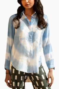 Featuring the Nube Tie Dye Blouse - a unique creation crafted from fine Chinese satin silk. Adorned with a stunning tie-dye technique in baby blue and natural off-white hues, this long-sleeve shirt boasts a loose fit and is adorned with five front buttons and four side buttons on each side. Made with 100% silk for luxurious comfort.