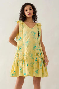 The Nubra Lemon Yellow Dress in Grape Print is a breezy, effortless piece with a relaxed fit. Delicate tie-up shoulder straps add a playful touch, while subtle piping and gathered details create graceful movement. Designed for ease, the seamless in-seam pockets blend functionality with style, making it a versatile choice for any occasion.