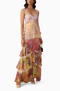 Featuring the Nude Daisy & Florescent Daisy Martina Dress by Saaksha & Kinni's Akara Collection A/W'25. A dual abstract floral print tiered maxi dress with a sweetheart neckline and adjustable straps, perfect for fluid movement and feminine charm.