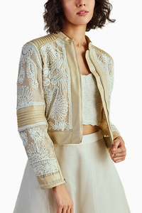 Featuring the Nude Ivory Leatherite Jacket by Roseroom, this elegant piece boasts detailed ivory chord embroidery and lace inlay. The quilting detail at the shoulders and sleeves provides a structured fit. Crafted from premium leatherite in a sophisticated nude color.