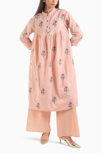 Elevate your everyday elegance with this nude pink kurta set, featuring delicate floral embroidery that speaks volumes in quiet sophistication. The gathered empire waistline adds a soft, feminine flair, while the classic collar and button-down placket offer a tailored finish. Crafted in breathable fabric, the kurta pairs effortlessly with wide-legged trousers for a relaxed yet polished silhouette.