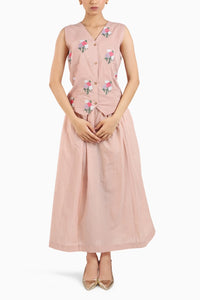 Nude pink cotton waistcoat and skirt set with delicate embroidery. The waistcoat features subtle threadwork and button-down detailing for a smart yet graceful look. Paired with a flowy matching skirt, this set is soft, breathable, and perfect for both everyday elegance and small festive occasions.