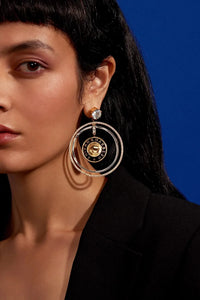 The Essence-This bold pair of dual orbital earrings are made with Morning Star stones coupled with classic enamel work. Wear it on a sleek dress or a chiffon sari -- this versatile accessory will amp up any look.
