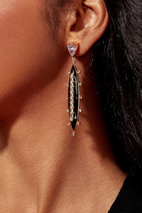 The Essence-This statement pair of drop earrings is carved out in an elongated oval shape. These can be worn with both Indian and western ensembles. Crafted with rich stones like Morning Star and Champagne Glare, and coupled with enamel work -- these earrings exude a noir vibe