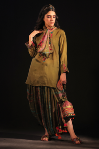 Introducing a harmonious blend of style and comfort: the short tunic paired with tie dye pleated dhoti and scarf, all crafted from luxurious habutai silk. The short tunic features a modern silhouette that exudes effortless charm, perfect for both casual outings and more formal occasions. Accompanying the tunic are the tie-dye pleated dhoti pants, which offer a contemporary twist on traditional attire. Completing the look is the scarf, which adds a layer of sophistication and versatility.
