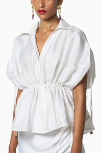 The Nuskha Shirt is crafted from Silk fabric and features gathered detailing at the waist for a flattering shape. The sleeves are finished with adjustable drawstrings, while the back is adorned with a beautifully embroidered fish artwork, adding an artistic touch to the design.