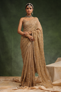 The BISCUIT-inspired saree is a masterpiece of intricate craftsmanship, where tradition meets opulence. The deep, rich fabric serves as the perfect canvas for the lavish fabric of tissue chanderi used in the entire saree with utmost patience and diligence.