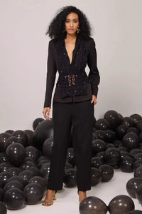 This eye-catching black blazer set features full sleeves and unique draping details on the front, accentuated by a vibrant array of multicolored rhinestones. Paired with tailored black tapered pants, this ensemble seamlessly blends elegance with a playful twist, making it a perfect choice for a stylish, standout look.