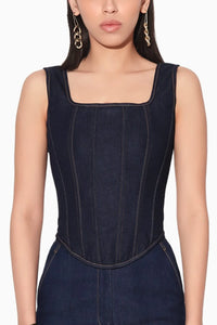 This classic structured denim corset combines timeless style with a flattering, fitted silhouette. Crafted from durable denim, it features clean lines and shaping seams that enhance the waist, making it a bold yet versatile piece that can be styled for both casual and elevated looks.