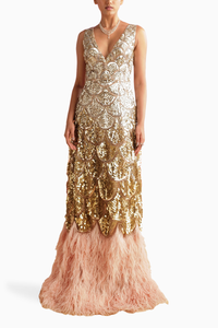 Featuring the Nymph Dress by NSS's The Bloom Collection, a dream in Blush crafted from Tulle & Crepe. This intricately hand-embroidered dress features feather detailing at the hem, creating a captivating and ethereal ensemble.