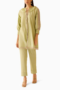 The Nysa Tunic combines an easy silhouette with distinctive lace and pintuck details. Crafted from 100% cotton poplin, it features a Chanderi ruffle neckline with a tie detail and 3/4 length sleeves with buttoned cuffs. This A-line tunic is effortlessly paired with matching narrow-fit cotton pants, rolled up at the bottom with pintuck accents. Lace designs may vary, adding a unique touch to each piece.