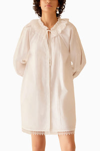 The Nysa Tunic offers an easy silhouette with unique lace and pintuck details. Made from 100% cotton poplin, it features a Chanderi ruffle neckline with a tie detail and 3/4 length sleeves with buttoned cuffs. This A-line tunic can be paired effortlessly with tonal cotton pants or worn alone for a relaxed, breezy look. Lace designs may vary for a touch of individuality.