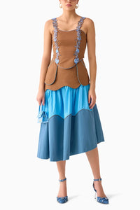 The Oasis tan cotton twill embroidered corset features a round neck, back elasticated with strap adjusters, and a curvy waistline with a side zipper. Paired with a tan, color-blocked three-tier skirt, it includes flap pockets, a side zipper, and a high-low hemline. This fit-and-flared design offers a stylish and flattering silhouette.