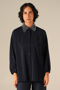 Featuring a navy blue kimono-style shirt, this piece is distinguished by an embroidered collar accented with white PVC loop detailing for a subtle yet striking touch.