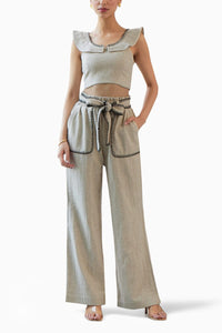 Oatmeal co-ord set featuring a top and pants adorned with blanket stitch hand embroidery.