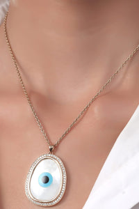 Oblong Mother of Pearl Evil Eye (30 mm) and Full Cut Diamond Chain Pendant. It has an adjustable clasp with 3 extra links.