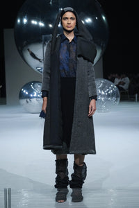 Featuring the Obscura Coat, crafted from hand-woven fabric with PVC cords and repurposed dori. Contrasting textures of transparent cords and black dori create visual interest. It showcases a bold, exaggerated symmetrical lapel framing the neckline and a full-length open front with clean lines.