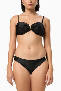 The Crescent bikini top offers a timeless bandeau silhouette elevated with sculpted Gold-tone hardware at the center—designed to catch the light and frame the bust with quiet glamour. Its softly gathered construction creates a flattering drape while the adjustable straps and built-in slit for optional padding ensure a personalised, comfortable fit. Equally chic worn under a breezy shirt or paired with our matching Crest bottoms for a seaside look that’s equal parts effortless and polished.