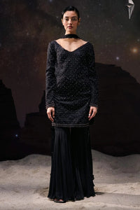 Draped in midnight elegance, this sequinned kurta and gharara set blends glamour with timeless sophistication, making it a statement piece for any grand occasion.