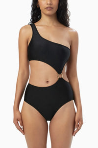 Ripple is an asymmetrical cut-out one-piece, a statement in modern minimalism and sculptural design. Crafted from premium stretch fabric, this sleek silhouette features a one-shoulder neckline and side cut-outs, connected with a gold ring detail that adds a touch of understated luxury