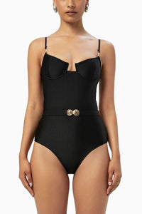 Elevate your resort wardrobe with Riviera—a timeless balconette style one-piece swimsuit that merges sculptural elegance with refined glamour. Designed with a flattering balconette neckline and underwired cups, it provides a beautifully contoured silhouette with subtle lift and support. The softly shimmering fabric adds a touch of understated opulence, while the adjustable straps and a statement belt with a signature shell gold-tone clasp accentuate the waist for a tailored finish.