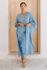 A two piece set featuring an embroidered overlay with solid pants. The overlay has kaftan style fit with side slits, embroidered front and hand detailed at the seams. The pants are high waisted with back elasticated waist and side pockets.