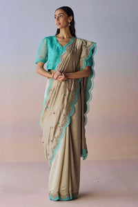 Handwoven in organza mulberry silk, the saree moves with the ease of water. Scalloped embroidery, delicately accented with luminous beads, lines the borders like glimmers on a tide. After the pleats, scattered hand-embroidered floral motifs bloom across the centre, while a coral-blue scalloped organza border flows gently along the border, adding a soft contrast to the drape.