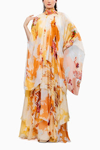 Elevate your style with our Ochre Chiffon Asymmetrical Embroidered Dress. The apricot crush embroidery adds a touch of elegance to this layered asymmetrical beauty, perfect for any special occasion.