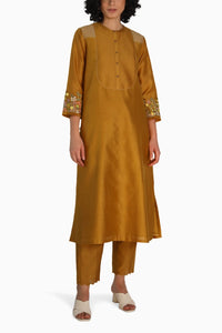 Featuring the silk chanderi Tunic with hand embroidery sleeve detail, paired with the matching pants which presents a sophisticated and graceful ensemble. Crafted from luxurious fabric, the tunic embodies understated elegance. This ensemble is a timeless addition to any wardrobe, offering a perfect balance of traditional craftsmanship and contemporary design.