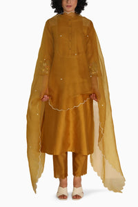 Featuring the silk chanderi Tunic with hand embroidery sleeve detail, paired with the matching pants and dupatta, presents a sophisticated and graceful ensemble. Crafted from luxurious fabric, the tunic embodies understated elegance. This ensemble is a timeless addition to any wardrobe, offering a perfect balance of traditional craftsmanship and contemporary design.
