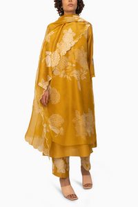 Introducing our ochre floral double-layered tunic and pants set, complete with a coordinating dupatta. This ensemble exudes elegance and charm, perfect for any occasion.